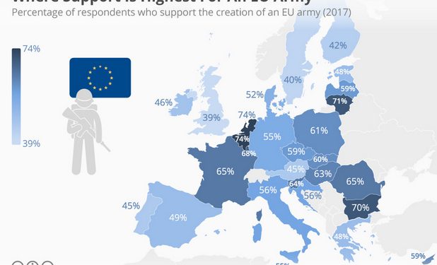 Η ιδέα ενός στρατού της ΕΕ εντοπίζεται αρχικά στην περίοδο αμέσως μετά τον Δεύτερο Παγκόσμιο Πόλεμο. Στην αρχή, είχε κάποια αρχική υποστήριξη, αλλά εγκαταλείφθηκε στα μέσα της δεκαετίας του ’50. Μετά την Κριμαία, τη σύγκρουση στο Ντονμπάς και εν μέσω της αναβαθμισμένης ρωσικής απειλής, η ιδέα έχει αναθερμανθεί. Ωστόσο, εξακολουθεί να είναι εξαιρετικά αμφιλεγόμενη σε πολλές γωνιές της Ευρώπης, όπως στο Ηνωμένο Βασίλειο, όπου μια ενωμένη στρατιωτική υπηρεσία με τους παλαιούς αντίπαλους του Δεύτερου Παγκοσμίου Πολέμου, χαρακτηρίζεται απαράδεκτη σε ορισμένες περιοχές. Άλλες χώρες της ΕΕ, θέλουν να αποφύγουν τη δημιουργία ενιαίας δύναμης, καθώς κάτι τέτοιο θα μετέβαλε την εμπεδωμένη διπλωματική τους θέση της στρατιωτικής ουδετερότητας..