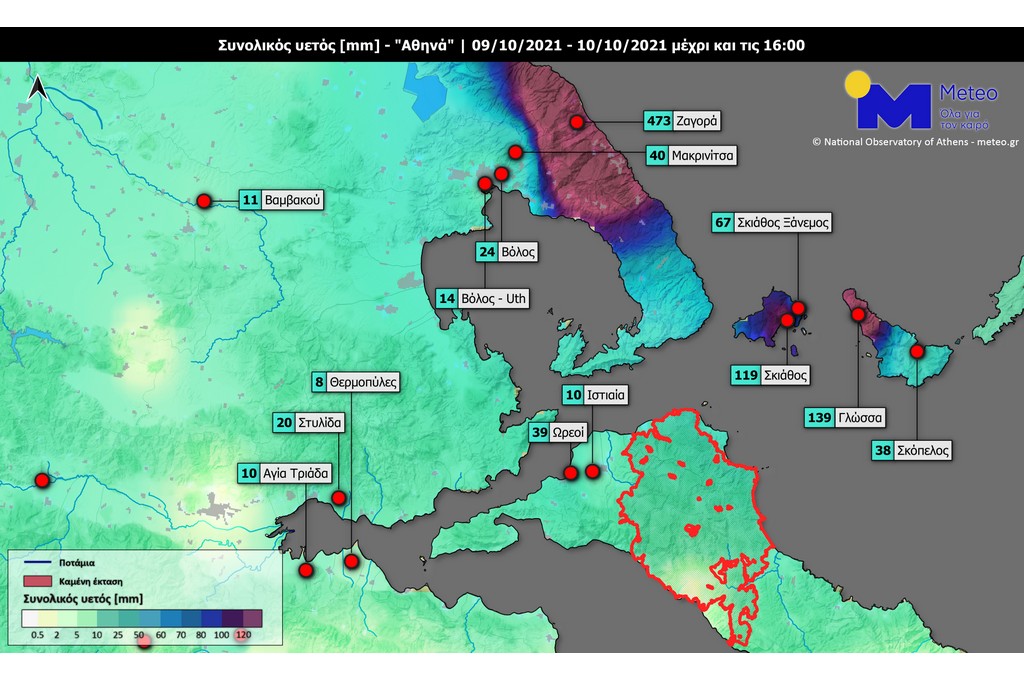 Σημαντικά προβλήματα έχουν προκληθεί σε περιοχές της Βόρειας Εύβοιας που επλήγησαν από τις μεγάλες πυρκαγιές του καλοκαιριού, καθώς και στο Ανατολικό Πήλιο όπου τα φαινόμενα παρουσιάζουν πολύ μεγάλη διάρκεια. Είναι χαρακτηριστικό ότι από το απόγευμα της Πέμπτης 07/10 έως το απόγευμα τις Κυριακής 10/10, ο αθροιστικός υετός που έχει καταγραφεί στη Ζαγορά Πηλίου μέσα σε 72 ώρες ξεπερνά τα 700 χιλιοστά, ύψος βροχής σχεδόν διπλάσιο από το ετήσιο ύψος βροχόπτωσης της Αθήνας.