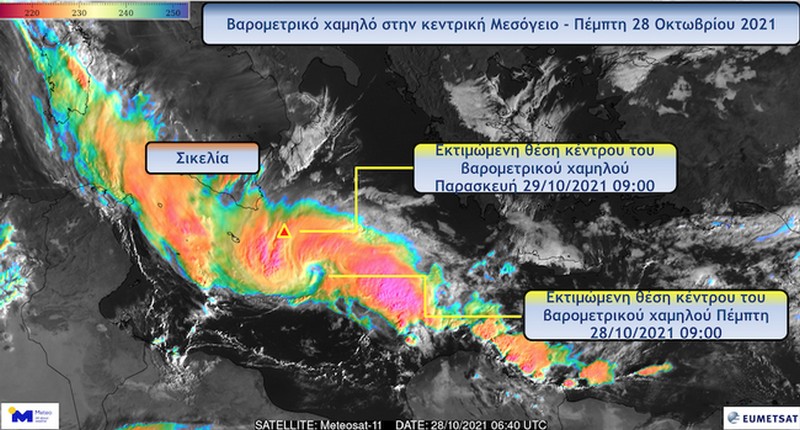 Σύμφωνα με τα τελευταία προγνωστικά στοιχεία το βαρομετρικό χαμηλό αναμένεται να κινηθεί προς την Σικελία τις επόμενες ώρες ωστόσο η ακριβής τροχία του στη συνέχεια παραμένει αρκετά αβεβαίη. Στην χώρα μας σήμερα Πέμπτη 28 Οκτωβρίου, αναμένουμε τοπικές βροχοπτώσεις στην Κρήτη.