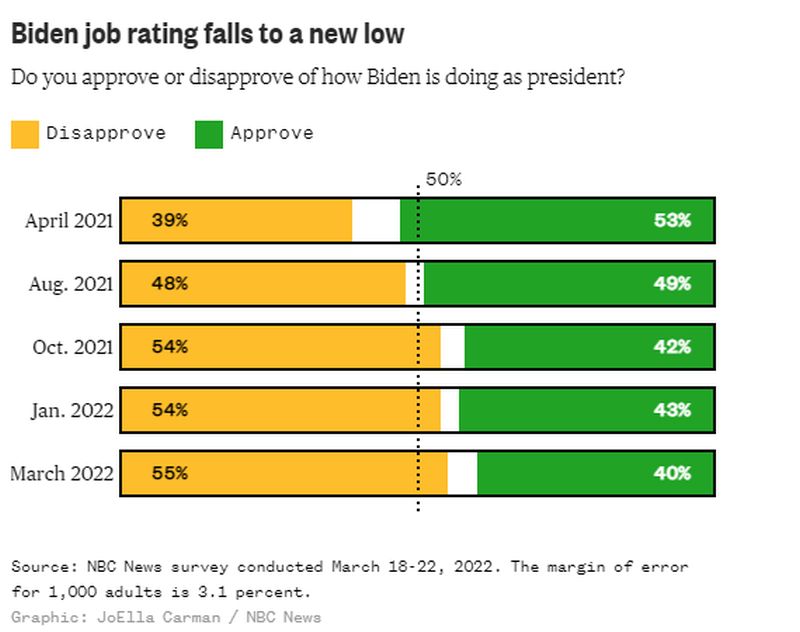 Η συνολική αποδοχή του Μπάιντεν μειώθηκε στο 40%, το χαμηλότερο ποσοστό της προεδρίας του, από 43% τον Ιανουάριο. Η δημοσκόπηση 18-22 Μαρτίου σε 1.000 ενήλικες είχε περιθώριο σφάλματος συν ή πλην 3,1%.
