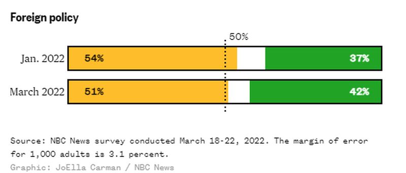 Επτά στους 10 Αμερικανούς που συμμετείχαν σε δημοσκόπηση του NBC News είπαν ότι είχαν πολύ λίγη, ή μόνο κάποια, εμπιστοσύνη στους χειρισμούς του Τζο Μπάιντεν όσον αφορά στην Ουκρανία. Μόλις το 12% εξέφρασε μεγάλη εμπιστοσύνη. Πάνω από το 80% ανησυχούσε ότι ο πόλεμος θα οδηγούσε στη χρήση πυρηνικών όπλων και το 74% ανησυχούσε ότι οι Η.Π.Α. θα έστελναν στρατεύματα στην Ουκρανία.