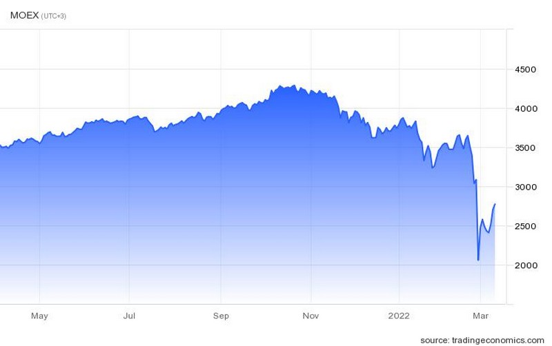Στα προ-εισβολής επίπεδα επέστρεψε ο MOEX στο Χρηματστήρι της Μόσχας, παραμένοντας ωστόσο περισσότεο από 1,000 μονάδες χαμηλότερα από τα επίπεδα του Ιανουαρίου, καθώς η κατρακύλα είχε ξεκινήσει νωρίτερα, όταν οι επενδυτές είχαν αρχίσει να αντιλαμβάνονται την όξυνση της κατάστασης και αποτιμούσαν σε ένα βαθμό τις προειδοοιήσεις των υπηρεσιών πληροφοριών των ΗΠΑ.