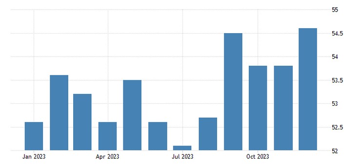 Ο S&P Global Russia Manufacturing PMI αυξήθηκε στο 54,6 τον Δεκέμβριο του 2023 από 53,8 τον Νοέμβριο. Τα στοιχεία δείχνουν την ταχύτερη επέκταση του κλάδου από τον Ιανουάριο του 2017 λόγω των συνεχών βελτιώσεων στην παραγωγή και της αύξησης των νέων παραγγελιών.