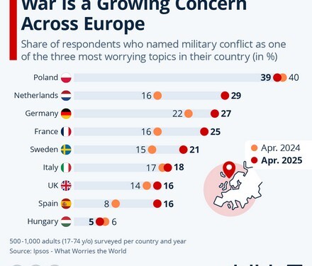 Με τις Ηνωμένες Πολιτείες υπό τον Ντόναλντ Τραμπ να μην θεωρούνται πλέον αξιόπιστος εταίρος και τη Ρωσία του Πούτιν να αποτελεί μια απρόβλεπτη απειλή, οι ανησυχίες για πιθανά στρατιωτικά επεισόδια έχουν αυξηθεί σε ολόκληρη την Ευρώπη. Σύμφωνα με τη μηνιαία έρευνα What Worries the World της Ipsos, όλο και περισσότεροι Ευρωπαίοι φοβούνται το ενδεχόμενο πολέμου, κατατάσσοντάς το στις τρεις σημαντικότερες ανησυχίες που αντιμετωπίζει σήμερα η χώρα τους. Όπως δείχνει το σχετικό διάγραμμα, οι ανησυχίες αυτές είναι ιδιαίτερα διαδεδομένες στην Πολωνία — κάτι που δεν προκαλεί έκπληξη, δεδομένου ότι συνορεύει με την Ουκρανία και βρίσκεται κοντά στον πόλεμο που μαίνεται εδώ και πάνω από τρία χρόνια.