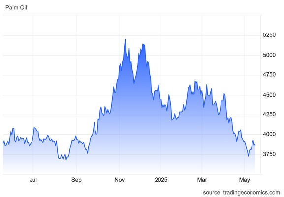 Τα συμβόλαια μελλοντικής εκπλήρωσης για το φοινικέλαιο στη Μαλαισία παρέμειναν κάτω από τα 3.900 MYR ανά τόνο, σημειώνοντας δεύτερη διαδοχική πτώση, μετά τα στοιχεία της Ένωσης Διαλυτικών Εκχυλιστών της Ινδίας, τα οποία έδειξαν ότι οι εισαγωγές φοινικέλαιου στη μεγαλύτερη χώρα αγοράς παγκοσμίως υποχώρησαν κατά 24,29% τον Απρίλιο, στους 321.446 τόνους.
