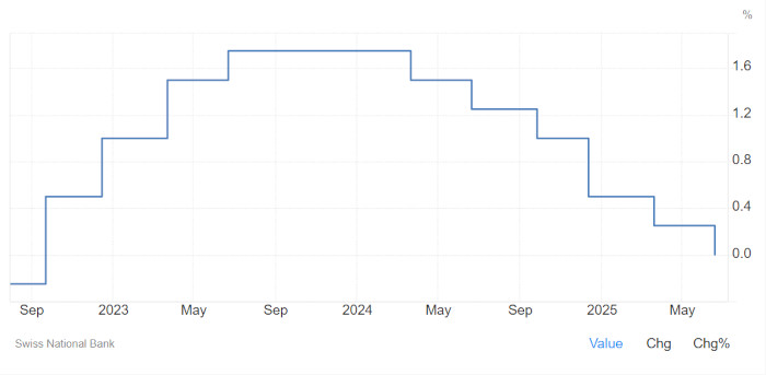 Η Ελβετική Εθνική Τράπεζα (SNB) μείωσε το επιτόκιο πολιτικής της κατά 25 μονάδες βάσης στο 0% τον Ιούνιο του 2025, όπως αναμενόταν, θέτοντας το κόστος δανεισμού στο μηδέν για πρώτη φορά από τα αρνητικά επιτόκια στα τέλη του 2022.