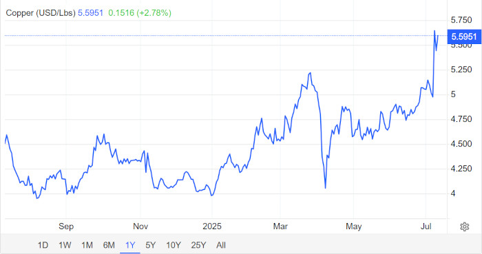 Τα συμβόλαια μελλοντικής εκπλήρωσης για τον χαλκό αυξήθηκαν την Πέμπτη στα περίπου 5,60 δολάρια ανά λίβρα, πλησιάζοντας στα ιστορικά υψηλά τους, αφότου ο πρόεδρος των ΗΠΑ, Ντόναλντ Τραμπ, επιβεβαίωσε ότι επιπλέον δασμοί 50% στις εισαγωγές χαλκού θα τεθούν σε ισχύ την 1η Αυγούστου.