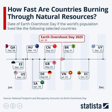 Οι εθνικές ημερομηνίες υπερκατανάλωσης για φέτος, όπως δημοσιοποιήθηκαν από το think tank Global Footprint Network, αποκαλύπτουν μια εξαιρετικά ανησυχητική εικόνα. Δεν δείχνουν απλώς την έκταση της υπερεκμετάλλευσης των φυσικών πόρων της Γης, αλλά και τις κραυγαλέες ανισότητες που επικρατούν μεταξύ των κρατών.