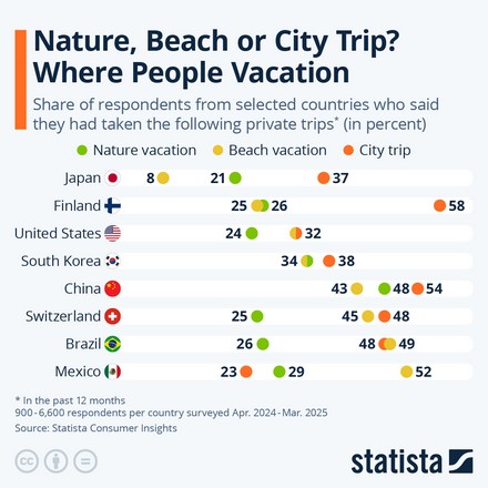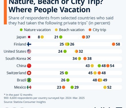 Όσοι προτιμούν ταξίδια σε πόλεις, εντοπίζονται κυρίως στη Φινλανδία και την Κίνα. Παράλληλα, οι Φινλανδοί δείχνουν ισχυρή προτίμηση και για κρουαζιέρες. Από την άλλη πλευρά, οι Κινέζοι δηλώνουν ότι πάνω από 40% εξ αυτών πραγματοποίησαν ταξίδι σε πόλη, παραλία ή φύση μέσα στους τελευταίους 12 μήνες — στοιχείο που αποδεικνύει τη δυναμική της Κίνας ως τουριστική δύναμη, τόσο στο εσωτερικό όσο και στο εξωτερικό.