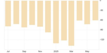 Το εμπορικό έλλειμμα των ΗΠΑ περιορίστηκε στα 60,2 δισ. δολάρια τον Ιούνιο του 2025, στο χαμηλότερο επίπεδο από τον Σεπτέμβριο του 2023, έναντι αναθεωρημένου ελλείμματος 71,7 δισ. δολαρίων τον Μάιο και εκτιμήσεων για έλλειμμα 61,6 δισ. δολαρίων.