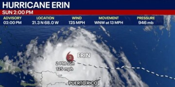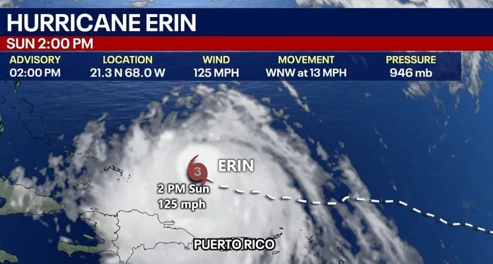 Ο τυφώνας Έριν συνεχίζει να εντείνεται, αφού αφού υποβαθμίστηκε το Σάββατο σε κατηγορία τρία, επανήλθε την Κυριακή σε κατηγορία τέσσερα με μέγιστους διατηρούμενους ανέμους 130 μιλίων/ώρα (215 χλμ./ώρα), σύμφωνα με το Εθνικό Κέντρο Τυφώνων των ΗΠΑ (NHC) στο Μαϊάμι.