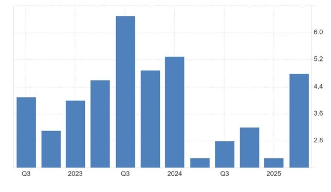 Η επέκταση αντικατόπτρισε ισχυρότερη ιδιωτική κατανάλωση (5,1% έναντι 1,6%), άλμα στις επενδύσεις (8,8% έναντι 1,8%), καθώς και αυξημένες εξαγωγές (1,7% έναντι 0,1%) και εισαγωγές (8,8% έναντι 2,7%). Αντίθετα, οι δημόσιες δαπάνες συρρικνώθηκαν απότομα (-5,2% έναντι 1,9%), επιβαρύνοντας τη συνολική ανάπτυξη.