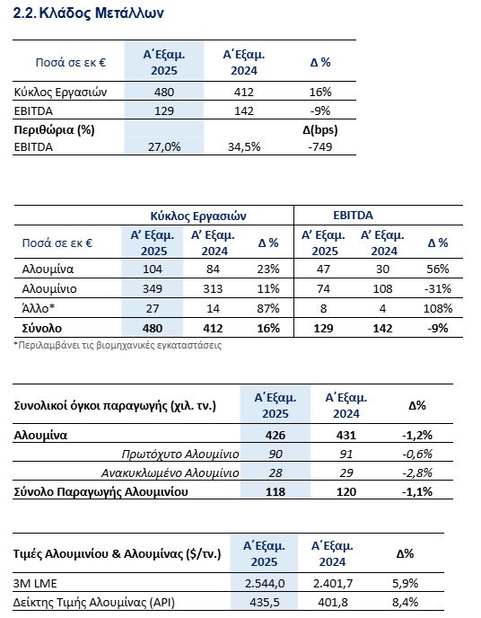 Ο Κλάδος Μετάλλων κατέγραψε Κύκλο Εργασιών €480 εκατ. που αντιστοιχεί σε 13% του συνολικού κύκλου εργασιών, σημειώνοντας αύξηση κατά 16% σε σχέση με το Α’ εξάμηνο του 2024. Τα Κέρδη προ Φόρων, Τόκων και Αποσβέσεων (EBITDA), διαμορφώθηκαν στα €129 εκατ. σημειώνοντας μείωση κατά 9% εκατ. σε σχέση με το Α’ εξάμηνο του 2024.