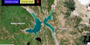 Εικόνα 1. Έκταση της περιφέρειας της λίμνης του Μόρνου τον Σεπτέμβριο 2025 και 2024 από τον δορυφόρο Sentinel-2.