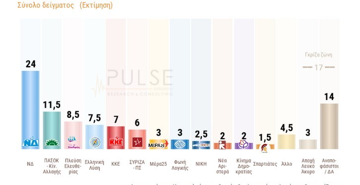 Η Νέα Δημοκρατία, λίγα 24ωρα μετά τις ανακοινώσεις του Κυριάκου Μητσοτάκη στην 89η ΔΕΘ, εμφανίζεται στο 24%, έναντι 11,5% που συγκεντρώνει το ΠΑΣΟΚ.