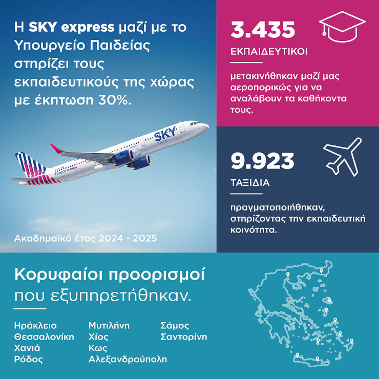 Το ακαδημαϊκό έτος 2024-2025, περισσότεροι από 3400 εκπαιδευτικοί ταξίδεψαν με τη SKY express σε κάθε γωνιά της Ελλάδας προς τον τόπο τοποθέτησής τους, πραγματοποιώντας συνολικά περίπου 10.000 ταξίδια. Η εκπαίδευση αποτελεί διαχρονική προτεραιότητα για τη SKY express, η οποία αγκαλιάζει και φέτος τη συγκεκριμένη πρωτοβουλία, επιβεβαιώνοντας τη δέσμευσή της να στέκεται αρωγός στους εκπαιδευτικούς της χώρας και να στηρίζει ουσιαστικά τις ανάγκες της ελληνικής κοινωνίας.