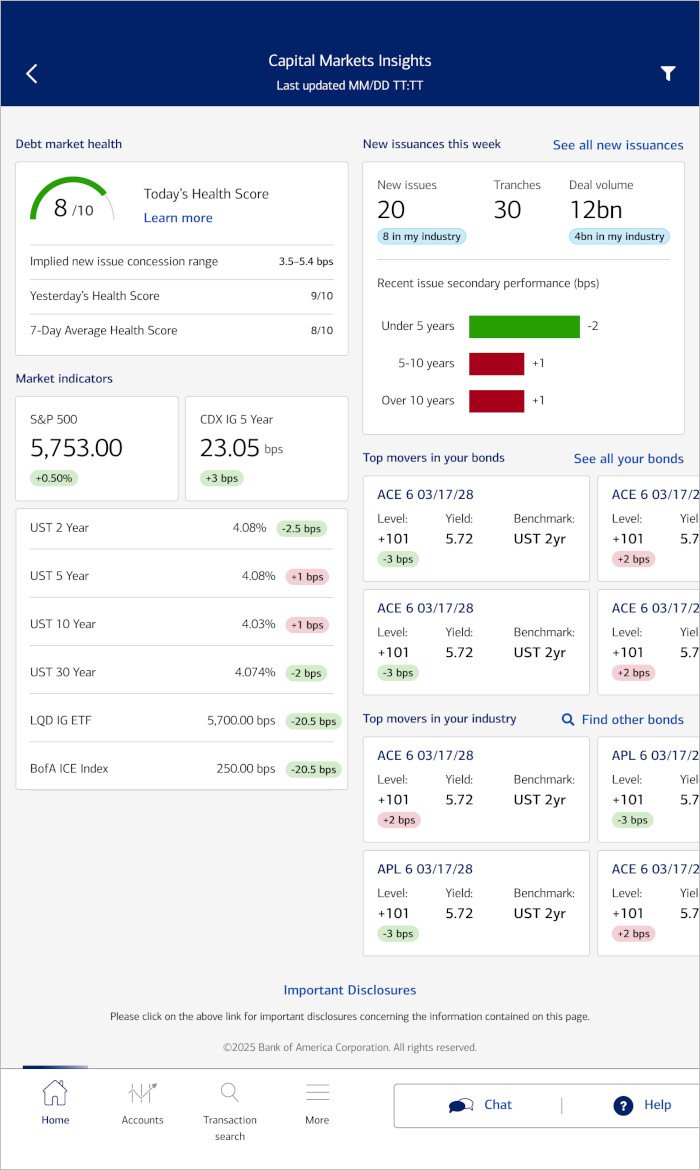 Αθήνα, – Η Bank of America ανακοινώνει αυτή την εβδομάδα την ενσωμάτωση των Capital Markets Insights στην εφαρμογή CashPro®, προσφέροντας στους πελάτες της στις ΗΠΑ μια ενιαία εικόνα δεδομένων και δραστηριότητας για τις επενδυτικές κεφαλαιαγορές. Το νέο εργαλείο ενσωματώνει επίσης τον ιδιόκτητο, τεχνολογικά προηγμένο Trade Evaluation Driver (TED), που βασίζεται σε τεχνητή νοημοσύνη και προσφέρει κρίσιμη υποστήριξη λήψης αποφάσεων απευθείας στα στελέχη και τις οικονομικές διευθύνσεις μέσω κινητού.