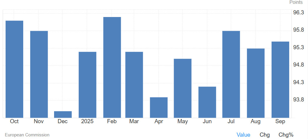 Ο δείκτης οικονομικού κλίματος (ESI) στην Ευρωζώνη αυξήθηκε ελαφρά τον Σεπτέμβριο 2025 στις 95,5 μονάδες από 95,3 τον Αύγουστο (αναθεωρημένο), ξεπερνώντας οριακά τις προβλέψεις της αγοράς για 95,2 μονάδες, σύμφωνα με την Ευρωπαϊκή Επιτροπή.