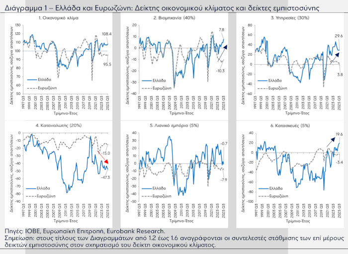 Εντούτοις, παρά την υπεραπόδοση της Ελλάδας έναντι της Ευρωζώνης, όχι μόνο σε πολλά μαλακά δεδομένα (soft data, οικονομικό κλίμα, επί μέρους δείκτες εμπιστοσύνης) αλλά και σε πολλά σκληρά δεδομένα (hard data, πραγματικός ρυθμός μεγέθυνσης), ο δείκτης εμπιστοσύνης καταναλωτή στην Ελλάδα παραμένει έντονα αρνητικός (-47,3 μονάδες το γ’ τρίμηνο 2025 σε όρους ισοζυγίου απαντήσεων) και υπολείπεται σημαντικά έναντι της Ευρωζώνης (-15,0 μονάδες). Μετά την ισχυρή άνοδό του το 2018 και το 2019 σε υψηλό 19,5 ετών (ολοκλήρωση του 3ου Προγράμματος Οικονομικής Προσαρμογής και διαμόρφωση προσδοκιών -εκείνη την περίοδο- για ισχυρότερη ανάπτυξη στο μέλλον), ο δείκτης οικονομικού κλίματος στην Ελλάδα επιδεινώθηκε απότομα και ισχυρότερα έναντι της Ευρωζώνης, τόσο κατά τη διάρκεια του πρώτου κύματος της πανδημίας το 2020 όσο και κατά τη διάρκεια της ενεργειακής κρίσης και του υψηλού πληθωρισμού το 2022. Το 2023 ανέκαμψε προσωρινά (προοπτικές για γρήγορη αποκλιμάκωση του πληθωρισμού), ωστόσο το 2024 επιδεινώθηκε ξανά (επίμονος πληθωρισμός, γεωπολιτικές εντάσεις, αβεβαιότητα) και έκτοτε παραμένει σε χαμηλά επίπεδα.