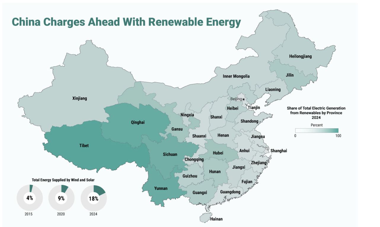 Πέρυσι, η Κίνα κατέγραψε αύξηση 18% στη δυναμικότητα αιολικής ενέργειας και 45% στη δυναμικότητα ηλιακής ενέργειας, επιτυγχάνοντας τον στόχο των 1,2 τεραβάτ ανανεώσιμης ισχύος που είχε θέσει ο Πρόεδρος Σι Τζινπίνγκ, πέντε χρόνια νωρίτερα από το προβλεπόμενο. Σύμφωνα με τον Διεθνή Οργανισμό Ενέργειας (IEA), τα επιτεύγματα της Κίνας καθιστούν εφικτό τον παγκόσμιο στόχο για τριπλασιασμό της ανανεώσιμης ισχύος έως το 2030. Αναμενόμενα, η πράσινη μετάβαση της Κίνας έχει αναμορφώσει και την πορεία των εκπομπών της: Παρά την αύξηση της ενεργειακής κατανάλωσης, η ταχεία ανάπτυξη των ανανεώσιμων πηγών σημαίνει ότι η νέα ζήτηση ηλεκτρισμού καλύπτεται ολοένα και περισσότερο από μη ορυκτές πηγές.