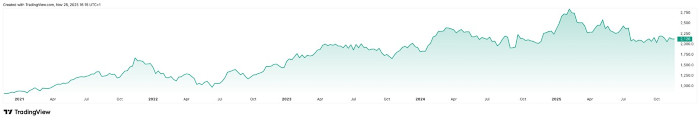 Εξέλιξη της τιμής της μετοχής της Hermès τα τελευταία 5 χρόνια. (Πηγή: tradingview.com)
