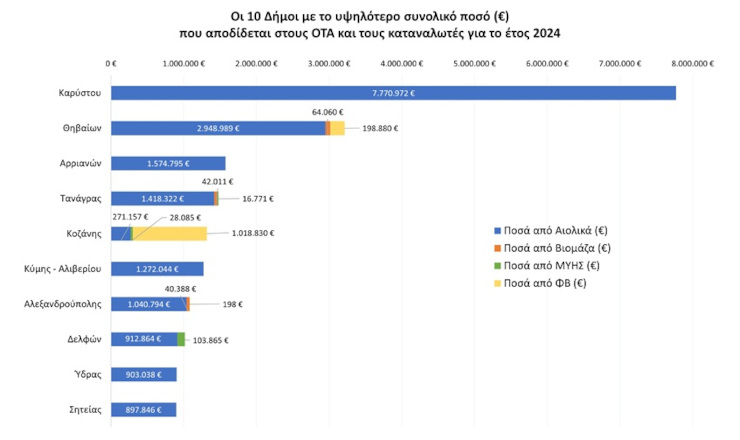 Τα ποσά από τα αιολικά πάρκα και λοιπές Α.Π.Ε. στους ΟΤΑ και τους καταναλωτές ρεύματος ανά Δήμο
