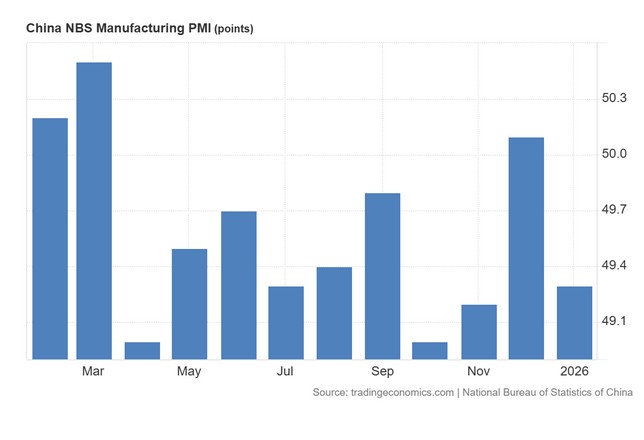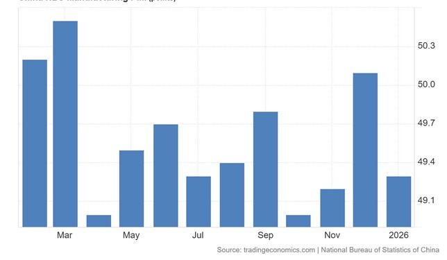Ο επίσημος δείκτης PMI μεταποίησης (Manufacturing PMI) της Κίνας, όπως καταρτίζεται από την Εθνική Στατιστική Υπηρεσία (NBS), υποχώρησε στις 49,3 μονάδες τον Ιανουάριο του 2026, από 50,1 μονάδες τον προηγούμενο μήνα, διαψεύδοντας τις εκτιμήσεις της αγοράς που τον τοποθετούσαν στις 50 μονάδες.