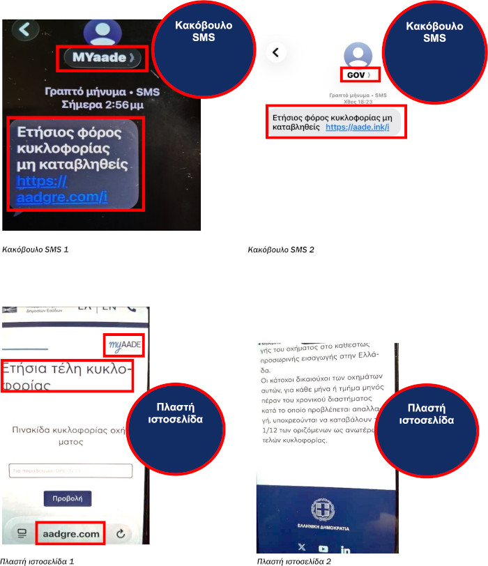 Τα μηνύματα αυτά, με την πρόφαση «μη καταβληθέντος ετήσιου φόρου κυκλοφορίας», ζητούν από τους παραλήπτες να πατήσουν σε σύνδεσμο (link) για να πληρώσουν δήθεν τέλη κυκλοφορίας οχημάτων.