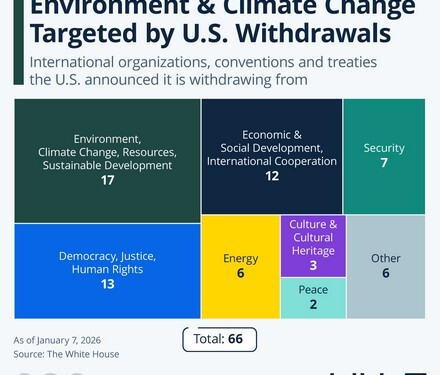 Όπως δείχνει το γράφημά μας, με βάση τον κατάλογο που δημοσίευσε ο Λευκός Οίκος, 17 από τις 66 συμφωνίες που στοχοποιήθηκαν από την κυβέρνηση Τραμπ αφορούσαν το περιβάλλον, την κλιματική αλλαγή, τους φυσικούς πόρους και/ή τη βιώσιμη ανάπτυξη. Σε αυτές περιλαμβάνονται αρκετοί φορείς του ΟΗΕ, όπως η Σύμβαση-Πλαίσιο των Ηνωμένων Εθνών για την Κλιματική Αλλαγή, το UN Oceans και το UN Water. Στο στόχαστρο του Λευκού Οίκου βρέθηκαν επίσης συμφωνίες που σχετίζονται με τη δημοκρατία, τη δικαιοσύνη και τα ανθρώπινα δικαιώματα. Ο πρόεδρος Τραμπ επέλεξε, μεταξύ άλλων, να αποσύρει τη χώρα του από τη Δομή του ΟΗΕ για την Ισότητα των Φύλων και την Ενδυνάμωση των Γυναικών, το Ταμείο Δημοκρατίας του ΟΗΕ και τη Διεθνή Επιτροπή Δικαίου.