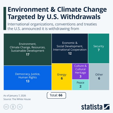 Όπως δείχνει το γράφημά μας, με βάση τον κατάλογο που δημοσίευσε ο Λευκός Οίκος, 17 από τις 66 συμφωνίες που στοχοποιήθηκαν από την κυβέρνηση Τραμπ αφορούσαν το περιβάλλον, την κλιματική αλλαγή, τους φυσικούς πόρους και/ή τη βιώσιμη ανάπτυξη. Σε αυτές περιλαμβάνονται αρκετοί φορείς του ΟΗΕ, όπως η Σύμβαση-Πλαίσιο των Ηνωμένων Εθνών για την Κλιματική Αλλαγή, το UN Oceans και το UN Water. Στο στόχαστρο του Λευκού Οίκου βρέθηκαν επίσης συμφωνίες που σχετίζονται με τη δημοκρατία, τη δικαιοσύνη και τα ανθρώπινα δικαιώματα. Ο πρόεδρος Τραμπ επέλεξε, μεταξύ άλλων, να αποσύρει τη χώρα του από τη Δομή του ΟΗΕ για την Ισότητα των Φύλων και την Ενδυνάμωση των Γυναικών, το Ταμείο Δημοκρατίας του ΟΗΕ και τη Διεθνή Επιτροπή Δικαίου.