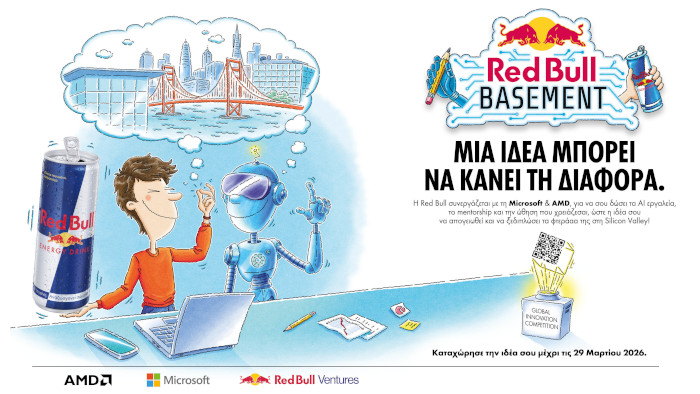 Φέτος, το Red Bull Basement 2026, σε συνεργασία με τη Microsoft και την AMD, δίνει ακόμη μεγαλύτερη έμφαση στη στήριξη της νέας γενιάς καινοτόμων μυαλών, συνδυάζοντας εργαλεία Τεχνητής Νοημοσύνης με ανθρώπινη καθοδήγηση, ώστε να υλοποιήσουν με επιτυχία την ιδέα τους.