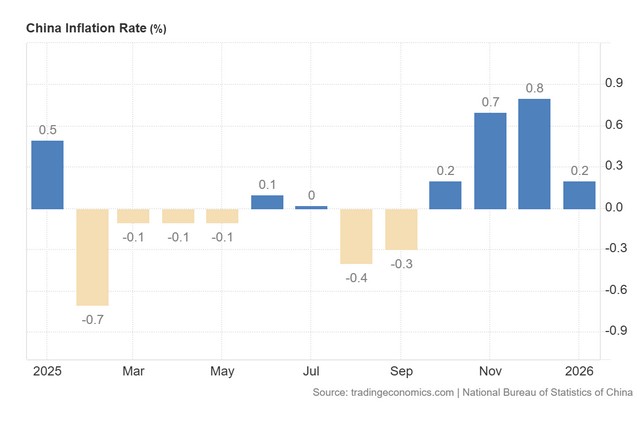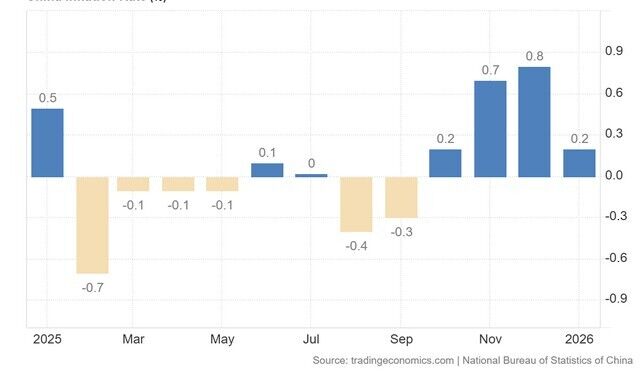 Ο ετήσιος πληθωρισμός στην Κίνα υποχώρησε απότομα στο 0,2% τον Ιανουάριο του 2026, έναντι 0,8% τον Δεκέμβριο, καταγράφοντας τη χαμηλότερη επίδοση από τον Οκτώβριο και διαψεύδοντας τις προσδοκίες της αγοράς για 0,4%.