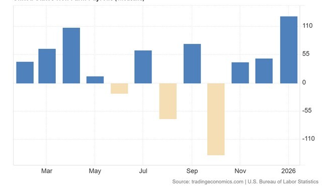 Η αμερικανική οικονομία πρόσθεσε 130.000 θέσεις εργασίας τον Ιανουάριο του 2026, σημαντικά υψηλότερα από την καθοδικά αναθεωρημένη αύξηση των 48.000 θέσεων τον Δεκέμβριο και σαφώς πάνω από τις προβλέψεις για 70.000.