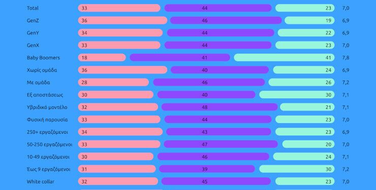 Η τάση είναι σαφής: η ικανοποίηση αυξάνεται με την ηλικία. Οι Gen X κινούνται κοντά στον γενικό μέσο όρο, ενώ οι νεότερες ηλικίες εμφανίζουν μεγαλύτερη απόσταση από τον εργοδότη τους.