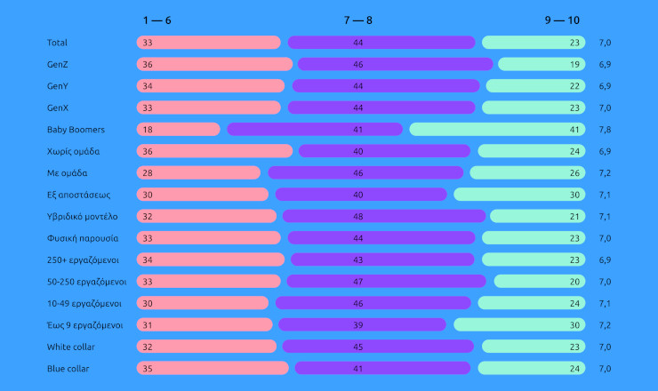 Η Gen Z εμφανίζει τα χαμηλότερα επίπεδα ικανοποίησης, καθώς το 36% τοποθετείται στη ζώνη 1-6 (μη ικανοποιημένοι), ενώ μόλις το 19% δηλώνει απόλυτα ή πολύ ικανοποιημένο (9-10). Αντίθετα, οι Baby Boomers καταγράφουν την πιο θετική εικόνα: μόνο το 18% δηλώνει μη ικανοποιημένο, ενώ το 41% τοποθετείται στη ζώνη υψηλής ικανοποίησης, με μέσο όρο 7,8 – τον υψηλότερο μεταξύ των γενεών.