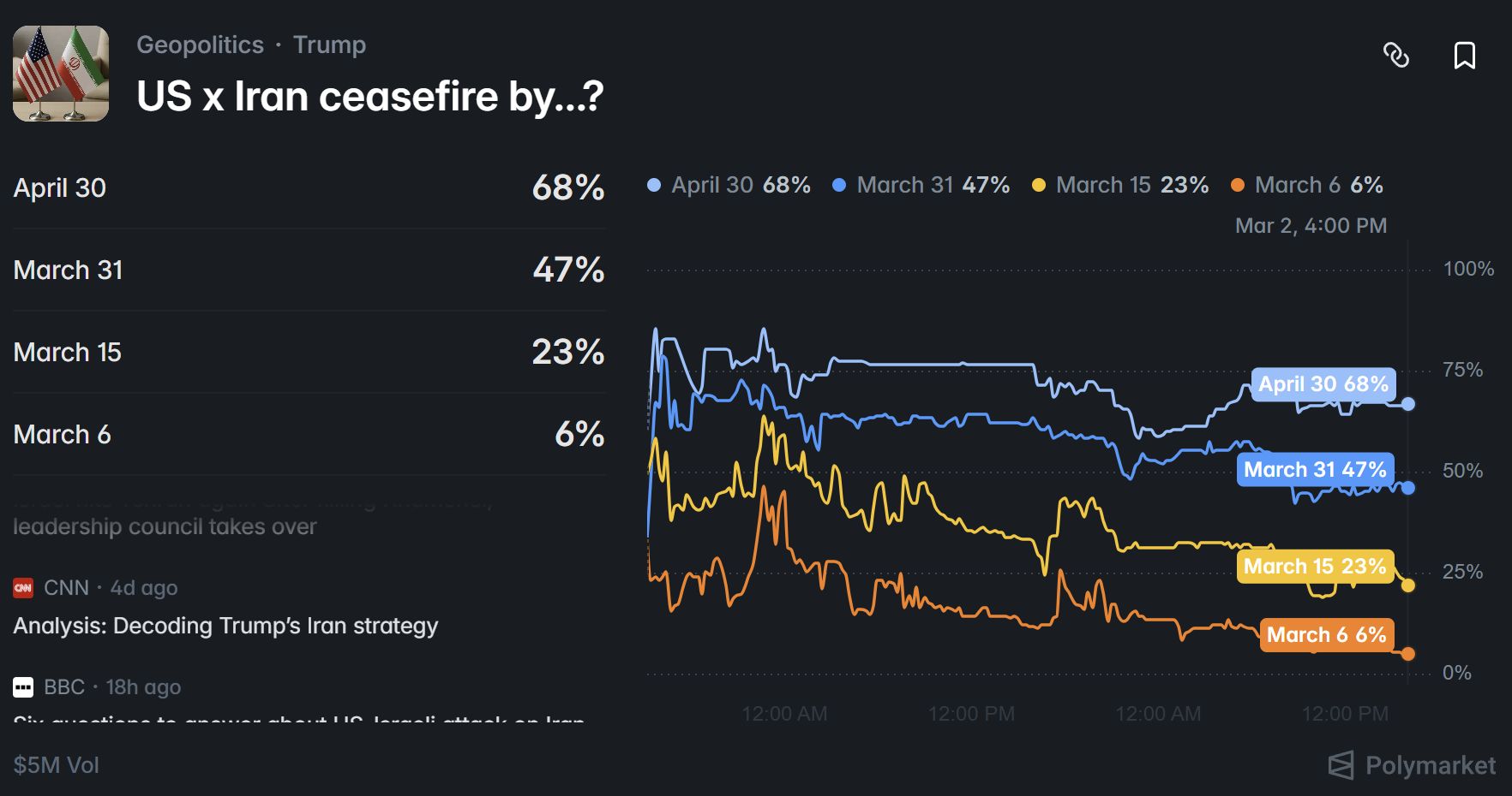 Οι αγορές προεξοφλούν εκεχειρία ΗΠΑ–Ιράν έως το τέλος Απριλίου, με την πιθανότητα να εκτινάσσεται στο 68%, σύμφωνα με τα συμβόλαια στο Polymarket.