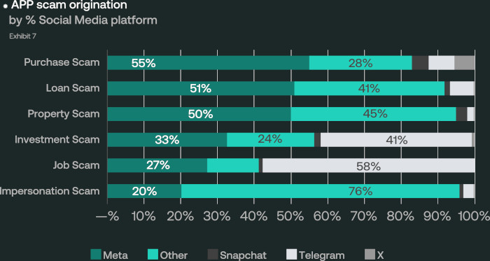 Παρότι οι πλατφόρμες της Meta εξακολουθούν να συγκεντρώνουν το μεγαλύτερο μερίδιο των αναφερόμενων περιστατικών (44%), η δυναμική του Telegram αλλάζει τον χάρτη της ψηφιακής απάτης. Σύμφωνα με τα στοιχεία της έκθεσης, το Telegram ευθύνεται πλέον για περίπου 21% των περιπτώσεων APP fraud, ποσοστό σχεδόν ισοδύναμο με το Facebook, ενώ σε συγκεκριμένες κατηγορίες – όπως οι εργασιακές απάτες – η κυριαρχία του είναι ακόμη πιο έντονη.