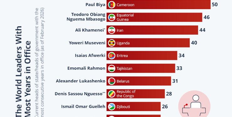 Στη λίστα -η οποία δεν περιλαμβάνει μονάρχες- στην πρώτη θέση βρίσκεται ο πρόεδρος του Καμερούν Paul Biya. Ηγείται της χώρας εδώ και 50 χρόνια, αρχικά ως πρωθυπουργός την περίοδο 1975-1982 και στη συνέχεια ως πρόεδρος. Στη δεκαετία του 1980 οικοδόμησε ένα αυταρχικό πολιτικό σύστημα στο Καμερούν και έκτοτε διατηρεί την εξουσία.