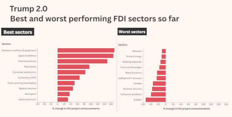 Σημαντικό κέρδος καταγράφει και ο φαρμακευτικός κλάδος, όπου τα projects αυξήθηκαν κατά 149% σε σύγκριση με τον μέσο όρο της προηγούμενης τετραετίας. Η ώθηση αυτή αποδίδεται εν μέρει και στις πιέσεις του Trump προς τις φαρμακευτικές εταιρείες να επεκτείνουν την παραγωγική τους βάση εντός ΗΠΑ, με την απειλή δασμών να λειτουργεί ως μοχλός πίεσης. Ωστόσο, το κείμενο επισημαίνει ότι οι ανακοινώσεις επενδύσεων δεν ταυτίζονται απαραίτητα με οριστικές κεφαλαιακές ροές και ενδέχεται σε ορισμένες περιπτώσεις να λειτουργούν και ως πολιτικό μήνυμα προσαρμογής προς τη νέα διοίκηση.