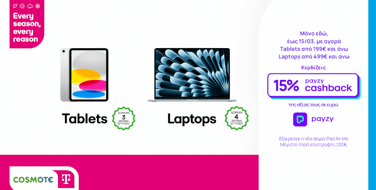15% επιστροφή της αξίας των αγορών τους σε ευρώ (cashback) κερδίζουν οι καταναλωτές που θα αποκτήσουν tablet ή και laptop[1] με κάρτα payzy στα καταστήματα της COSMOTE TELEKOM και ΓΕΡΜΑΝΟΣ σε όλη την Ελλάδα, αλλά και στα cosmote.gr και germanos.gr. Η προσφορά ισχύει μέχρι και τις 15 Μαρτίου 2026, για κάθε αγορά tablet αξίας 199€ και άνω και laptop αξίας 499€ και άνω[2].