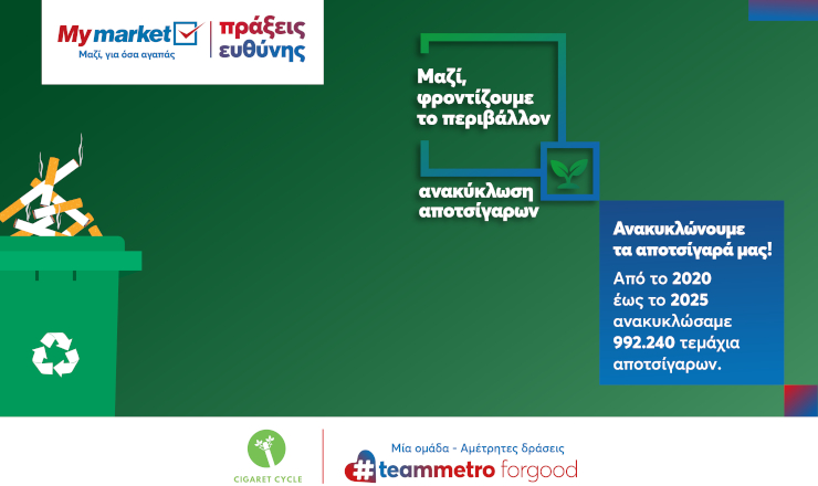 Η METRO AEBE στο πλαίσιο της συνεργασίας με την ΑΜΚΕ Cigaret Cycle και το πρόγραμμα #gopafree, από το 2020 μέχρι το 2025 συγκέντρωσε σχεδόν ένα εκατομμύριο αποτσίγαρα τα οποία οδηγήθηκαν προς ανακύκλωση.