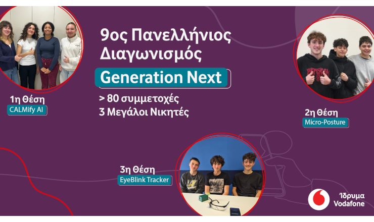 Το Ίδρυμα Vodafone ανακοίνωσε τις τρεις νικήτριες ομάδες του 9ου Πανελλήνιου Διαγωνισμού Generation Next, αποδεικνύοντας έμπρακτα πώς η τεχνολογία μπορεί να αξιοποιηθεί προς όφελος της κοινωνίας. Με οδηγό την θεματική «Η τεχνολογία ως σύμμαχος: Η ψηφιακή ευημερία μέσα από την χρήση της τεχνολογίας», περισσότερες από 80 μαθητικές ομάδες γυμνασίου από όλη την χώρα παρουσίασαν δημιουργικές και καινοτόμες λύσεις που αξιοποιούν την τεχνολογία για την αντιμετώπιση προκλήσεων στην καθημερινότητά τους ή στην τοπική τους κοινότητα.