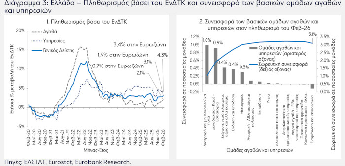 Όσον αφορά το γενικό επίπεδο των τιμών, ο ετήσιος πληθωρισμός στην Ελλάδα, βάσει του Εναρμονισμένου Δείκτη Τιμών Καταναλωτή (ΕνΔΤΚ), παρέμεινε κοντά στο 3,0% τους πρώτους μήνες του 2026, δηλαδή σε επίπεδα παρόμοια με εκείνα του προηγούμενου έτους. Σύμφωνα με την Ελληνική Στατιστική Αρχή (ΕΛΣΤΑΤ), διαμορφώθηκε στο 3,1% τον Φεβ-26 (έναντι 1,9% στην Ευρωζώνη), από 2,9% τον Ιαν-26. Ο γενικός δείκτης τιμών των υπηρεσιών αυξήθηκε σε ετήσια βάση κατά 4,3%, ενώ ο αντίστοιχος δείκτης των αγαθών κατά 2,1% (βλ. Διάγραμμα 3.1). Στα αγαθά, κυρίαρχο ρόλο διαδραματίζει ο πληθωρισμός των μη επεξεργασμένων τροφίμων (12,5% τον Φεβ-26), ενώ στις υπηρεσίες ξεχωρίζουν οι υπηρεσίες στέγασης (7,3% τον Φεβ-26).