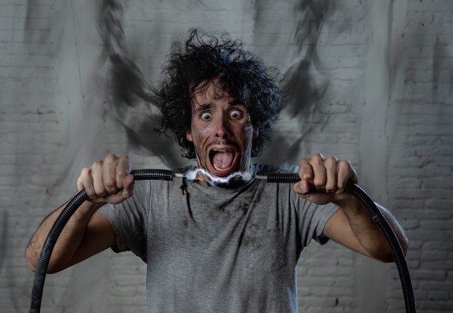 Man getting electric shock connecting broken electrical cables at home. Husband having domestic accident being electrocuted with dirty burnt face and crazy expression. Electricity DIY repairs danger.