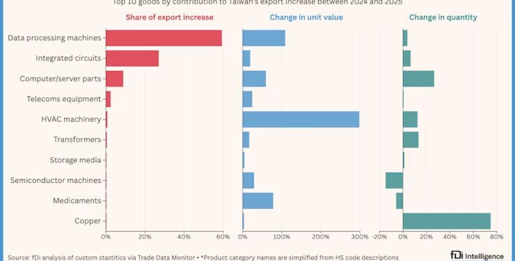 Σύμφωνα με στοιχεία που επεξεργάστηκε το fDi Intelligence, οι εξαγωγές της Ταϊβάν ανήλθαν πέρυσι σε 641 δισ. δολάρια, καταγράφοντας άνοδο περίπου 167 δισ. δολαρίων σε σχέση με το 2024, ή 35% σε ετήσια βάση. Ωστόσο, σχεδόν όλη αυτή η αύξηση προήλθε από μόλις τρεις κατηγορίες προϊόντων: μηχανές επεξεργασίας δεδομένων, ολοκληρωμένα κυκλώματα και συναφή εξαρτήματα. Μόνο οι μηχανές επεξεργασίας δεδομένων αντιστοιχούσαν περίπου στο 60% της συνολικής ανόδου, στοιχείο που αποτυπώνει τη διεθνή έκρηξη της ζήτησης για AI servers.