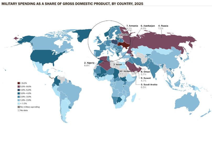 Ενδιαφέρον παρουσιάζει το εύρημα μεταβολής στη δεκαετία από το 2016 έως το 2025, που σημειώνει αύξηση δαπανών είναι 35%, γεγονός που δείχνει μια σταθερή ενδυνάμωση του αμυντικού τομέα μέσα στα χρόνια ακόμα και πριν τις μεγάλες διεθνείς αναταραχές και πολεμικές συρράξεις.