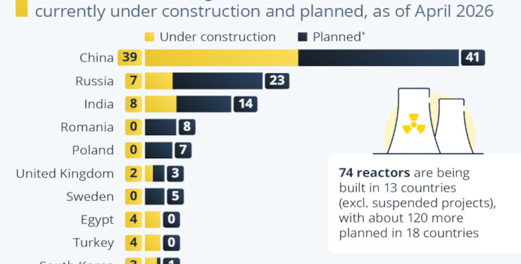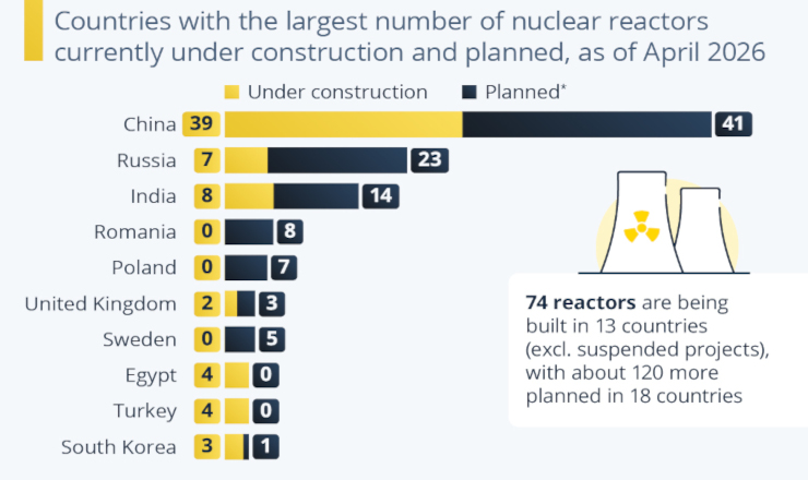 Σύμφωνα με στοιχεία της World Nuclear Association, έως τον Απρίλιο του 2026 βρίσκονται υπό κατασκευή 74 πυρηνικοί αντιδραστήρες σε 13 χώρες – εξαιρουμένων έργων που έχουν ανασταλεί στην Ιαπωνία, την Ουκρανία και τη Βραζιλία – ενώ περίπου 120 ακόμη βρίσκονται στο στάδιο του σχεδιασμού.