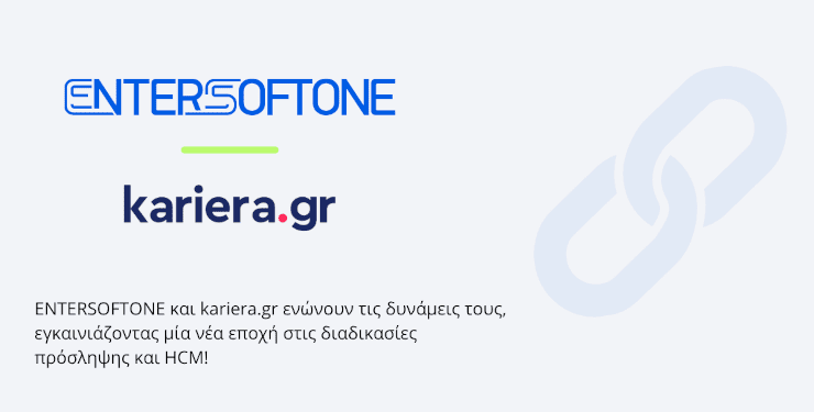 Η ENTERSOFTONE και το kariera.gr ανακοινώνουν την έναρξη στρατηγικής συνεργασίας, αντανακλώντας την κοινή τους δέσμευση για την ανάληψη δράσεων και πρωτοβουλιών που προάγουν τη διαμόρφωση ενός πιο συγχρόνου και αποδοτικού μοντέλου λειτουργίας σε όλο το φάσμα της διαχείρισης ανθρώπινου δυναμικού και επιταχύνουν έμπρακτα τον ψηφιακό μετασχηματισμό της λειτουργίας HR.